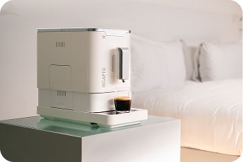 Des machines compactes, élégantes et pratiques qui préparent un café fraîchement moulu en un seul clic. Parfaites pour les chambres d’hôtel.